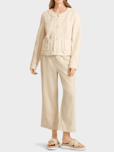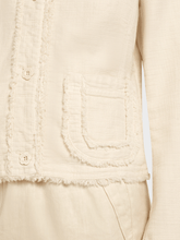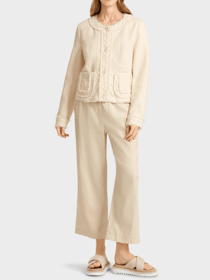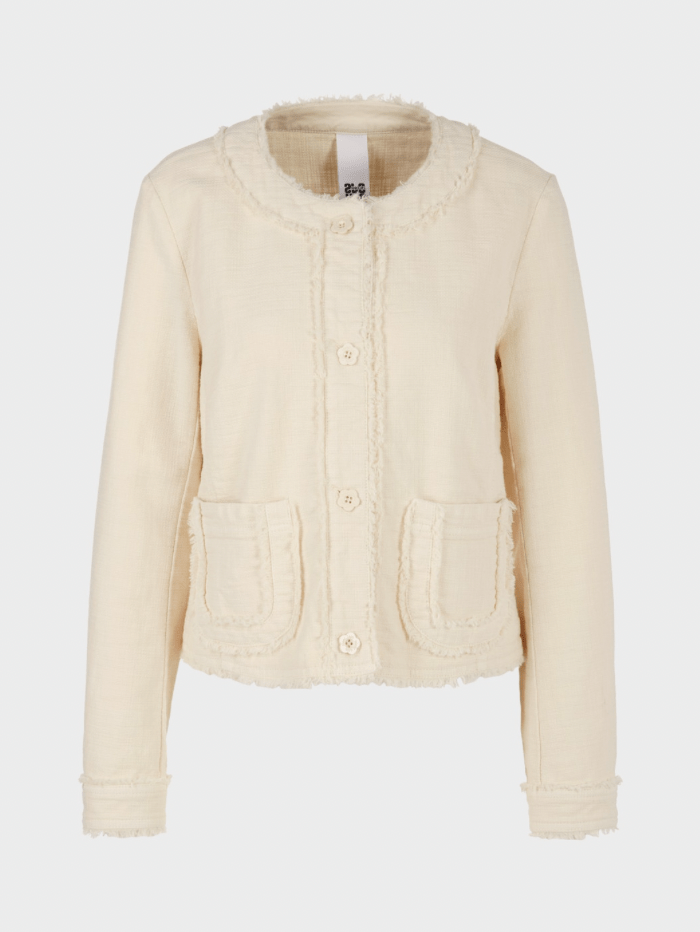 Feminine jacket in cotton with elastane. This jacket has playful fringes on the hem, the panels and the cuffs. The rounded pockets are also decorated with fringes. The jacket fastens with romantic floral buttons. Darts and princess seams ensure a figure-hugging fit.