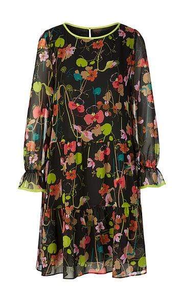 Wide cut dress by Marc Cain with long sleeves made of slightly transparent microfibre quality. The floral flounce dress is printed all over with coloured flowers and leaves. The arm and neckline edges are accentuated with a contrasting colour. The feminine dress is closed with a small button at the neck.