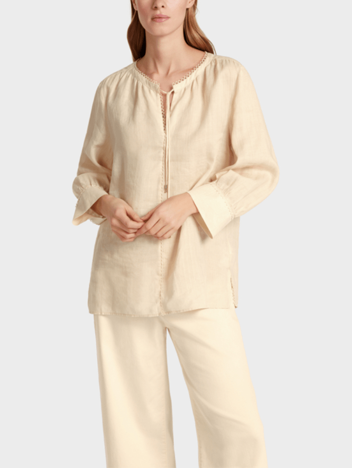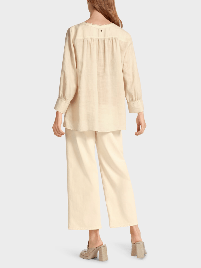 This cream coloured top by Marc Cain is made from China grass and is soft to the touch. It has a tone on tone lace trim at the neckline and the gathered shoulder yoke at the back gives it a little more volume. The drawstring ribbons at the neck are finished with a decorative metal chain tassel and the Marc Cain initials. A fabulous and timeless edition to your summer wardrobe.